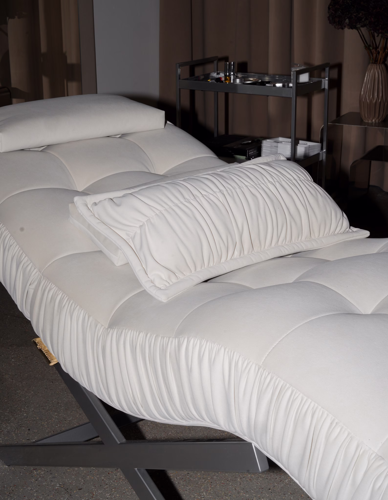 Charakterystyczne marszczenia boczne nadają bryle luksusowego, architektonicznego charakteru – fotel nie wtapia się w salon, tylko buduje jego wizerunek od pierwszej sekundy. Miękka tapicerka teddy dopełnia formę ciepłem i przytulnością, którą klientki czują od pierwszego dotyku.